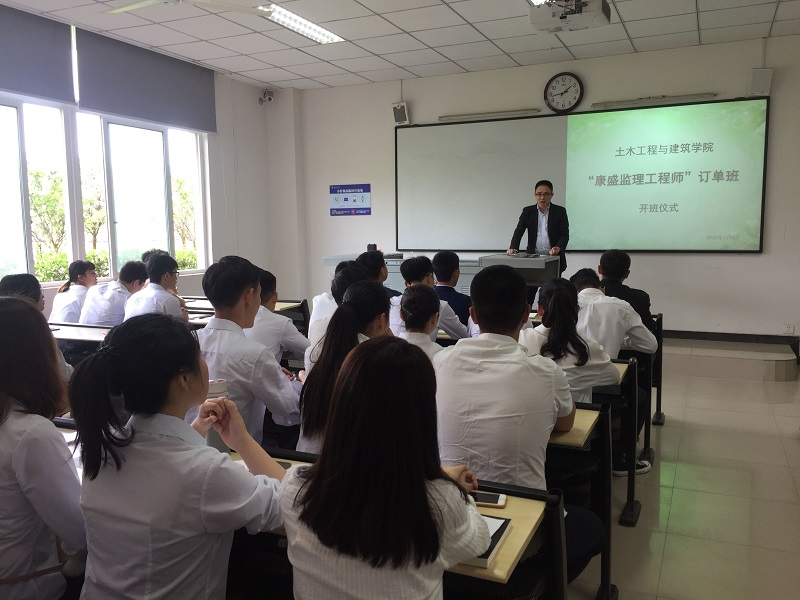 本网讯(文/图土木学院唐可义、陈锦月 大学生记者团) 为进一步深化校企合作,提高人才培养质量,5月6日下午,土木工程与建筑学院在六教6120教室举行专门仪式,正式启动“康盛监理工程师”订单班。