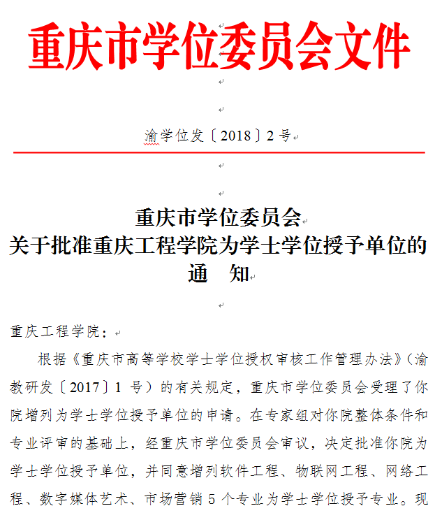本网讯(党委宣传部刘胜江)重庆市学位委员会近日发出通知,根据专家组整体条件现场评审和增列学士学位授予专业评审意见,批准重庆工程学院为学士学位授予单位,同时同意增列软件工程、物联网工程、网络工程、数字媒体艺术、市场营销等5个专业为学士学位授予专业。这是学校在18年办学实践中迈出的又一重大步伐。