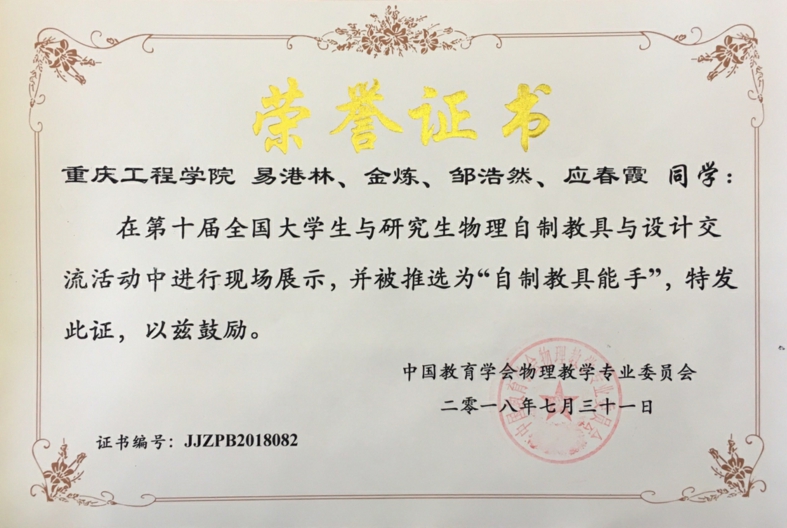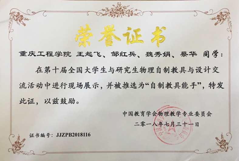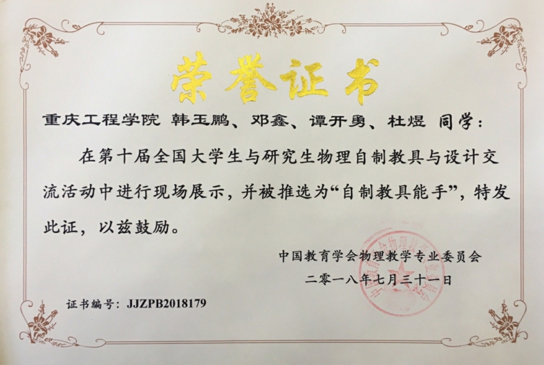 本网讯(通识学院李龙、大学生记者团)从7月29日至31日在长江大学举行的第十届全国大学生与研究生物理教学技能与培养交流会现场再传捷报,重庆工程学院选派的三支代表队最终斩获交流会创新实验设计与自制教具展示活动3项“自制教具能手”荣誉。