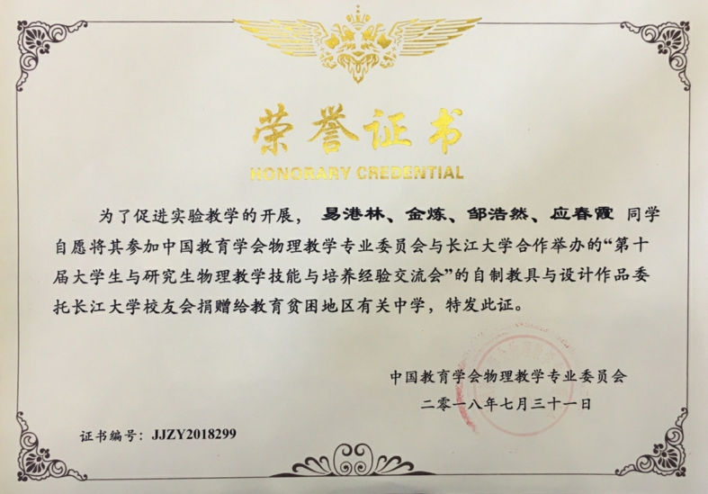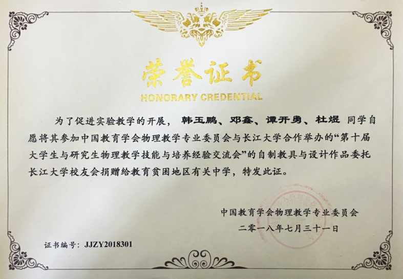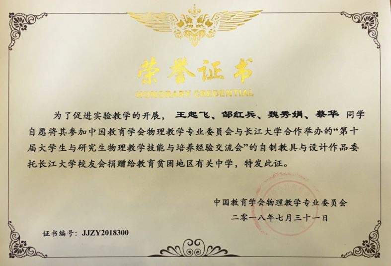 据了解,参加展示活动的三支代表队,由来自2017级软件工程、数字媒体技术、物联网工程、电子信息工程、网络工程、自动化、智能科学与技术等本科专业的12名同学组成,他们在通识学院张楠与董福龙两位老师的指导下,携带自制教具振动演示仪(成员为王起飞、邹红兵、蔡华、魏秀娟)、多功能机械波演示仪(成员为邓鑫、韩玉鹏、谭开勇、杜煜)和万用表改装原理演示仪(成员为易港林、邹浩然、金炼、应春霞)参加交流会创新实验设计与自制教具展示活动,最终斩获3项“自制教具能手”荣誉,他们自制的教具与设计作品将委托长江大学校友会捐赠给教育贫困地区有关中学。