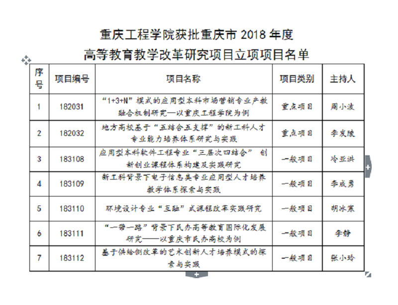 本网讯(文/教务处陈艳、大学生记者团) 重庆市教委近日下发专门通知,公布全市2018年度高等教育教学改革研究项目立项名单。我校推荐的7个项目,获批立项重点项目2项、一般项目5项。