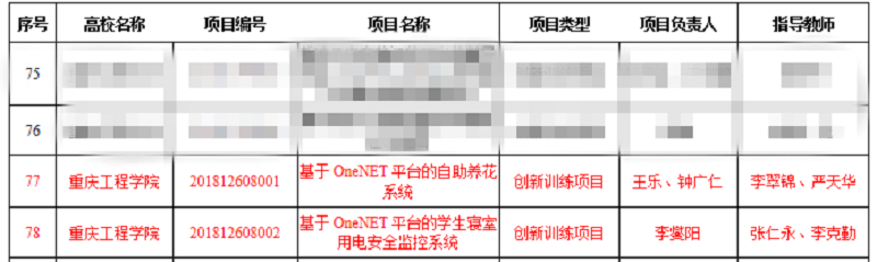 我校入选的两个项目,一项是《基于OneNET平台的自助养花系统》,项目负责人为王乐、钟广仁,指导老师为李翠锦、严天华,一项是《基于OneNET平台的学生寝室用电安全监控系统》,入选项目负责人为李燮阳,指导老师为张仁永、李克勤。