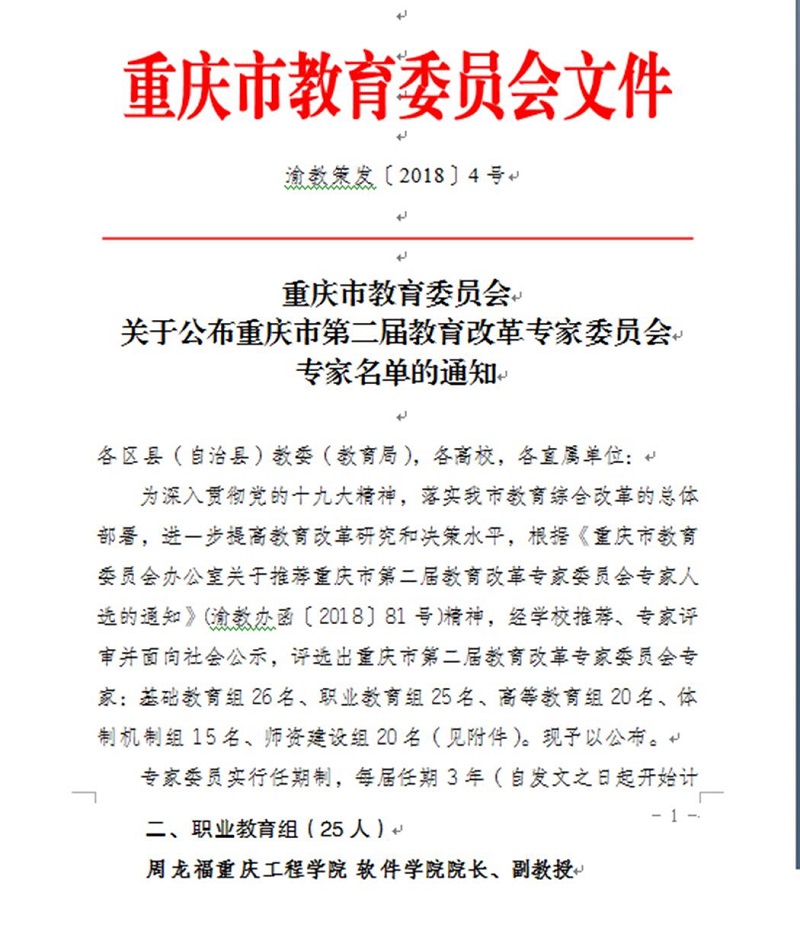 本网讯(文/软件学院周萍萍、大学生记者团)重庆市教育委员会近日发出通知,公布重庆市第二届教育改革专家委员会专家人选,校软件学院院长周龙福副教授榜上有名,入选重庆市第二届教育改革专家委员会专家库。