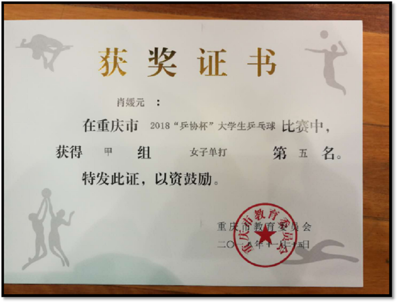 比赛过程中,我校乒乓球队与重大、西政代表队等20多支队伍同台竞技,其中女队以压倒性实力,先后战胜重医和川美代表队晋级前八强,以小组第一名的成绩进入决赛,最后获得女子乒乓球团体(甲组)第五名。同时,肖媛元与吴金焱、黄代辉与郑麓墁同学并列女子双打第五名,肖媛元同学获得女子单打第五名,肖媛元与吴金焱同学被评为体育道德风尚奖先进个人。