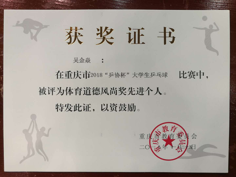 本网讯(文/通识学院唐娴、大学生记者团)2018年重庆市“乒协杯”大学生乒乓球比赛11月25日在重庆邮电大学闭幕,经过激烈角逐,我校乒乓球队最终获得女子团体第五名、女子双打第五名、女子单打第五名的好成绩,2人获评体育道德风尚奖先进个人。
