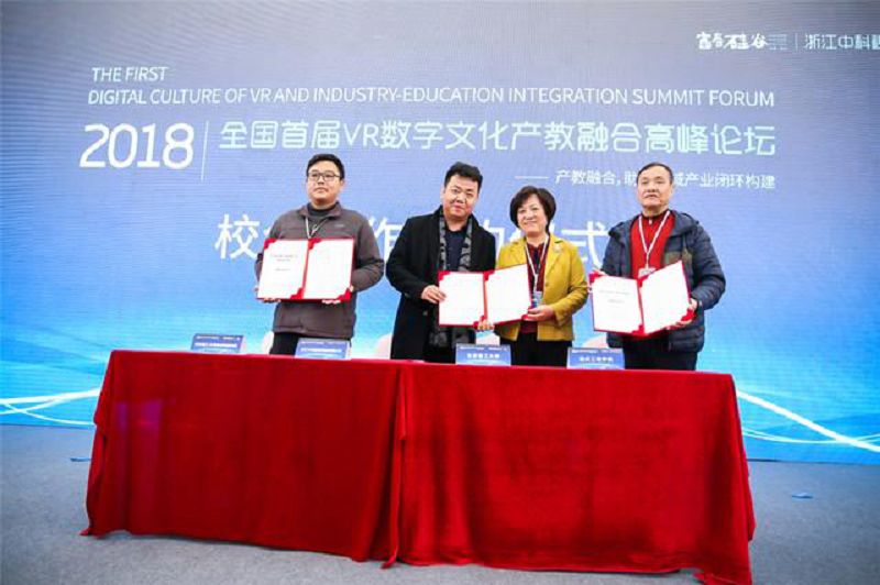 本网讯(校企合作办黄梅、大学生记者团)11月30日,学校校长唐一科教授、党委书记兼常务副校长张业平,参加在浙江省杭州市富春硅谷举办的全国首届VR数字文化产教融合高峰论坛,与相关企业代表签署校企合作协议,围绕VR数字文化产教融合问题,与国内同行进行广泛交流。