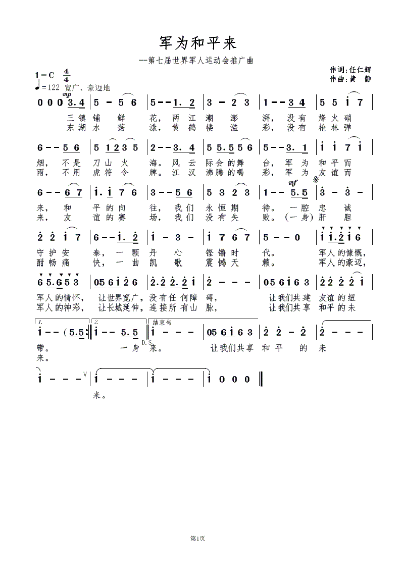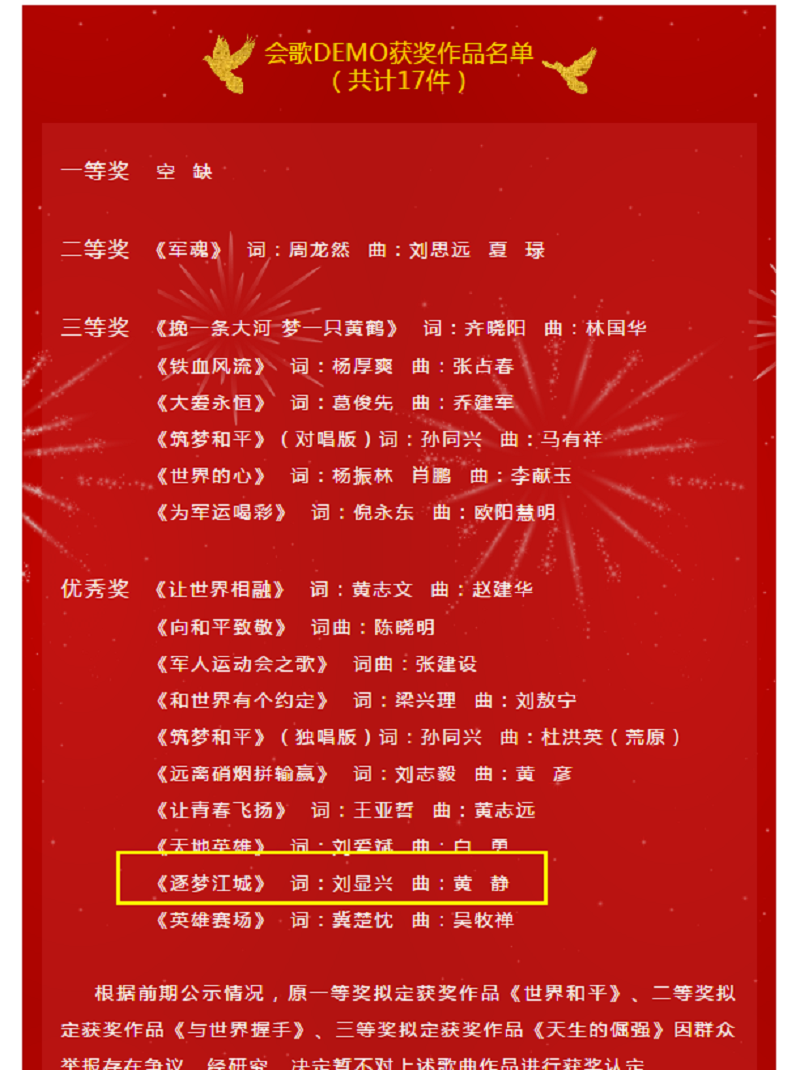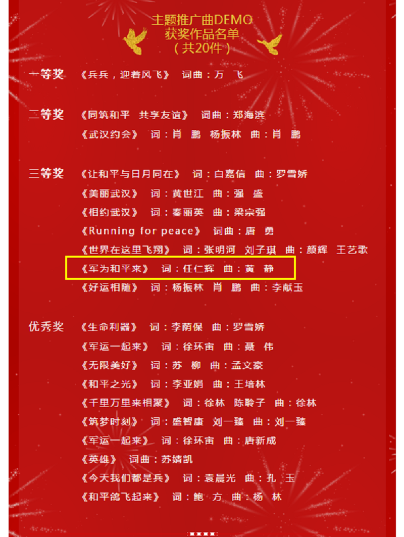 据悉,获得本次征集活动主题推广曲DEMO(样片)三等奖的曲目,是黄静作曲、任仁辉作词的《军为和平来》。这首歌以宽广、豪迈的曲调,表达通过承办世界军人运动会,共建友谊纽带、共享和平未来的美好祝愿。黄静作曲的另外一首歌曲《逐梦江城》,获得本次征集活动会歌DEMO(样片)优秀奖。