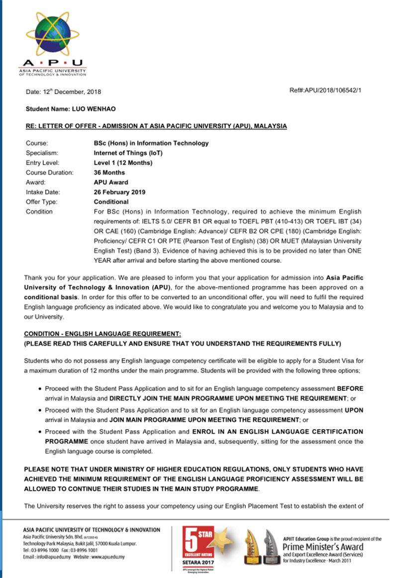 (文、图/国际处 余佳姮)2019年2月28日,我校软件学院2016级软件技术专业(专科)学生罗文豪同学获得马来西亚亚太科技大学的新生录取通知书,正式成为该校物联网专业(本科)学生。