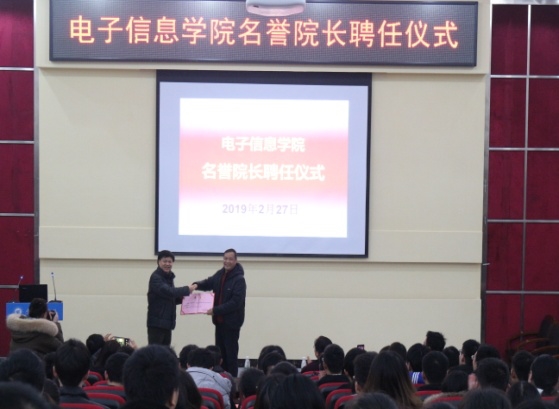 本网讯(电子信息学院涂敦兰、大学生记者团)2月27日下午14点,我校电子信息学院名誉院长聘任仪式在行政楼一楼报告厅举行,校长唐一科、副校长王琼花出席,电子信息学院全体教师、各专业学生代表参加,聘任仪式由执行院长秦安碧主持。