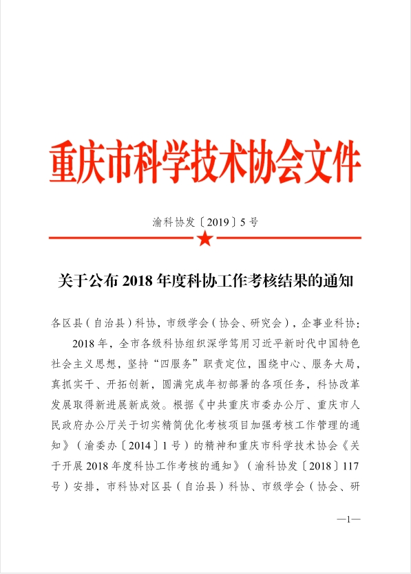 本网讯(文、图/科技处 夏冬梅)近日,重庆市科学技术协会印发《关于公布2018年度科协工作考核结果的通知》(渝科协发〔2019〕5号),公布了2018年全市各区县(自治县)科协、市级学会(协会、研究会)、企事业科技协会的工作考核结果,我校科技协会获评“2018年度科学技术协会工作一等奖”。