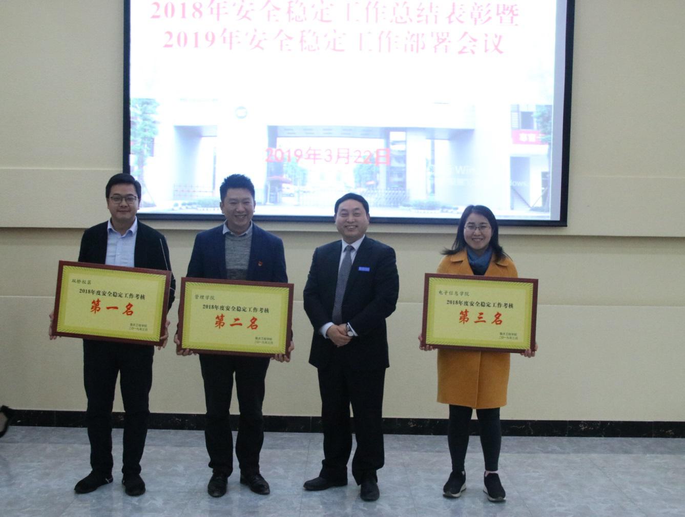 会上,唐书记总结了2018年学校安全稳定工作,并对2019年校园安全稳定工作作了新的规划部署。校党委副书记盛友兴同志宣读了《关于2018年安全稳定工作考核结果的通报》,出席领导先后为获得安全稳定工作考核前三名的职能部门和二级学院颁奖。获得第一类职能部门安全稳定工作考核前三名分别为党政办、图书馆、学工部,获得第二类职能部门安全稳定工作考核前三名分别为教务处、人事处、科技处。获得二级学院安全稳定工作考核前三名分别为双桥校区、管理学院、电子信息学院,双桥校区办公室主任高亮现场分享了管理经验。最后,校党委书记张业平在总结讲话时强调,全体教职工一是要在工作中要压实安全责任;二是要加强教育引导,把安全意识灌输给每个人的同时提升安全预防和事件处置能力;三是要重视细节,提高管理水平,实现学校的长治久安。