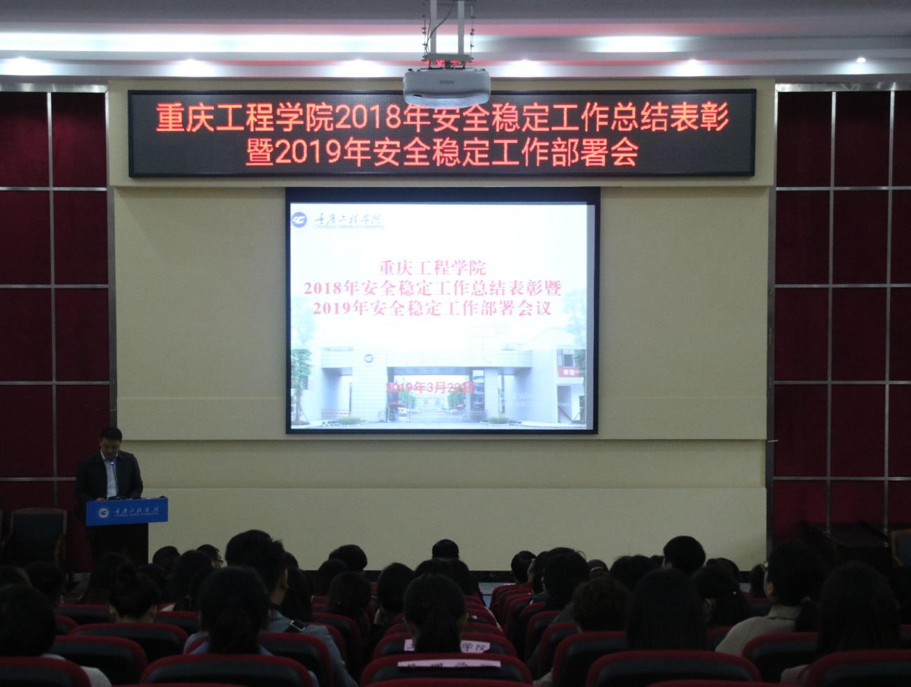 本网讯(文/党委武装部 罗心智、图/大学生记者团)3月22日下午14点10分,我校南泉校区办公楼阶梯报告厅召开了2018年安全稳定工作总结表彰会暨2019年安全稳定工作部署会议。党委书记兼常务副校长张业平、校党委副书记盛友兴,纪委书记兼工会主席唐小勇出席。各二级学院院长、党总支书记、学工办主任、辅导员,各职能部门兼职安全员、生活老师代表、保安人员代表共计80余人参加,会议由保卫处长熊力同志主持。