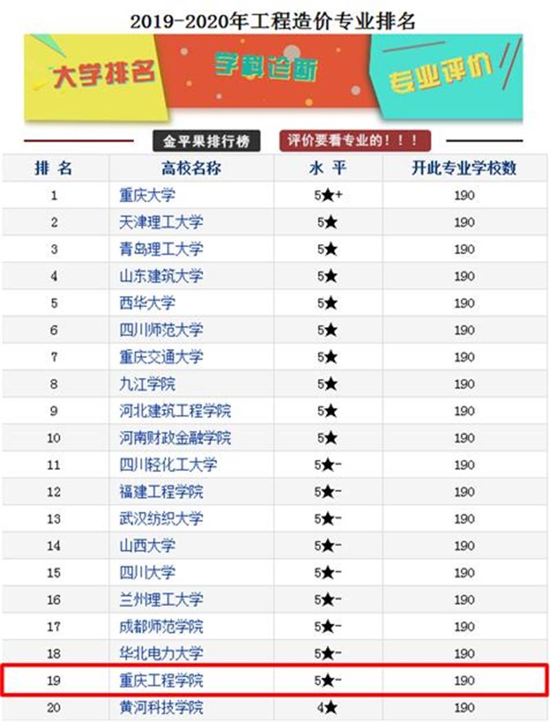本网讯(文/图 土木工程学院新闻中心 华少帅)中国科教评价网近日发布了《工程造价专业排名——金平果2019年中国大学分专业竞争力排行榜》。我校土木工程学院“工程造价”专业位列第19名,也是该专业首次进入全国二十强。