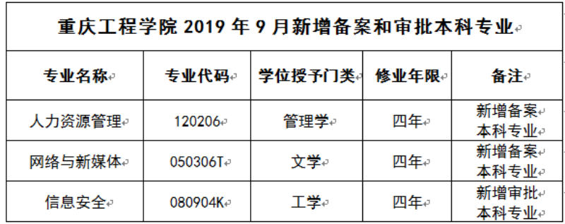 本网讯(文/教务处 魏玉琛)根据《教育部关于公布2018年度普通高等学校本科专业备案和审批结果的通知》,重庆工程学院于2019年9月将新增“信息安全”、“人力资源管理”、“网络与新媒体”三个本科招生专业。