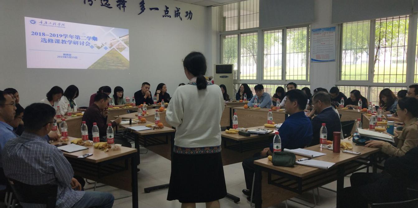 本网讯(文/教务处 蒋克锋 图/教务处 胡娟)5月15日中午,我校2018-2019学年第二学期选修课教学研讨会在大学生服务中心一楼举行。会议由教务处处长李静主持。副校长程昌华,副校长兼双桥校区管委会主任、党总支书记、通识学院院长蒋国华,各二级学院教学副院长以及本学期全体选修课授课教师和教师发展中心、教务处有关人员参加会议。