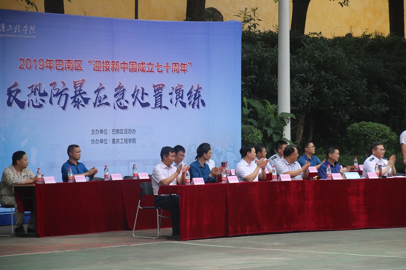 区委常委政法委书记、区反恐怖工作领导小组组长朱本权,副区长、区公安分局党委书记、局长、区反恐怖工作领导小组副组长何内平,区公安分局政委刘伦波,重庆工程学院党委书记张业平,重庆工程学院党委副书记盛友兴,区反恐办常务副主任、区公安分局副局长朱明臣,重庆工程学院纪委书记唐小勇出席了本次演练。