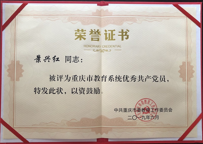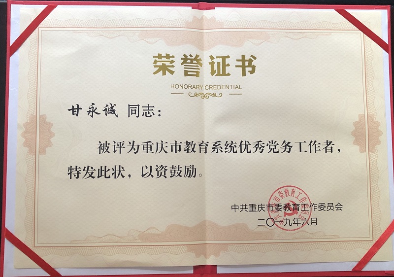 此外,学校党委委员、党政办公室主任、组织部(统战部)部长甘永诚荣获“重庆市教育系统优秀党务工作者”称号,电子信息学院党总支副书记、副院长景兴红荣获“重庆市教育系统优秀共产党员”称号。