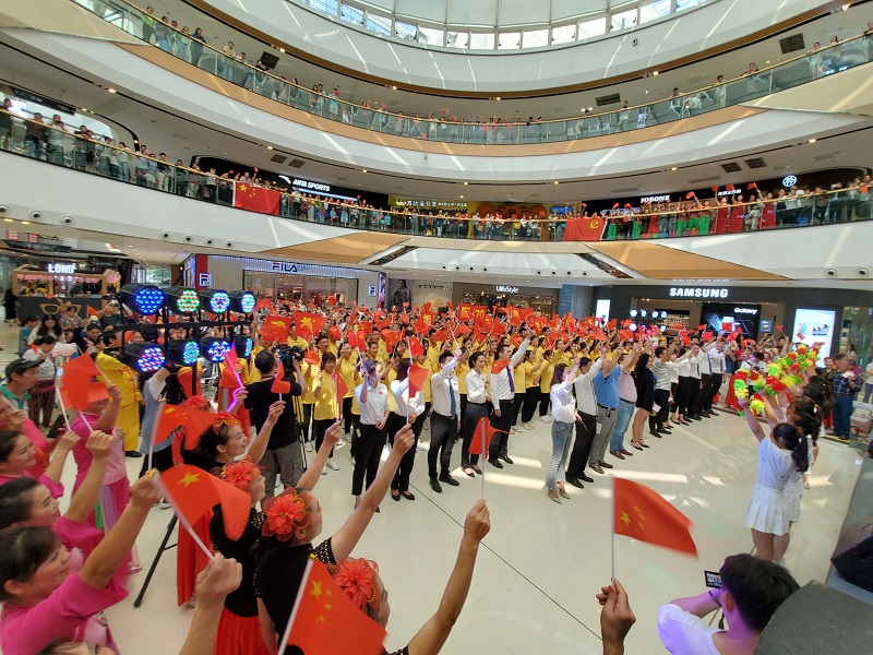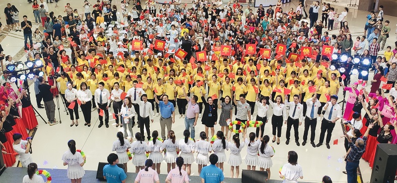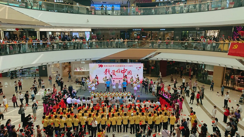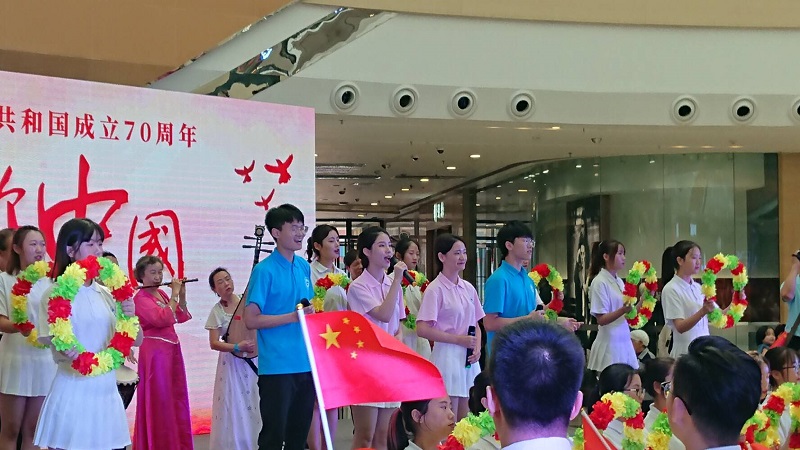 上午8时,120名同学和活动指导老师赶到巴南区万达广场,11时左右,活动正式开始。现场同学们挥舞国旗、齐唱歌曲《我和我的祖国》,饱含真情的歌声迅速点燃了现场气氛,激发了现场观众的爱国情怀,有不少市民主动加入到活动中,与同学们一同合唱。此次活动的开展,体现出了重工师生浓厚的爱国情怀,也展现出重工师生优秀的活动组织能力和艺术表演水平,是我校师生为祖国七十华诞送上的美好祝福。