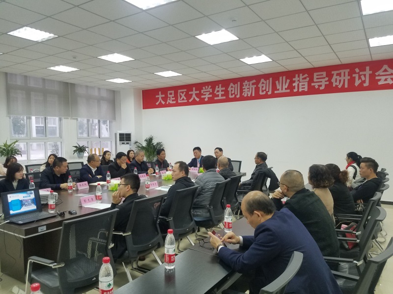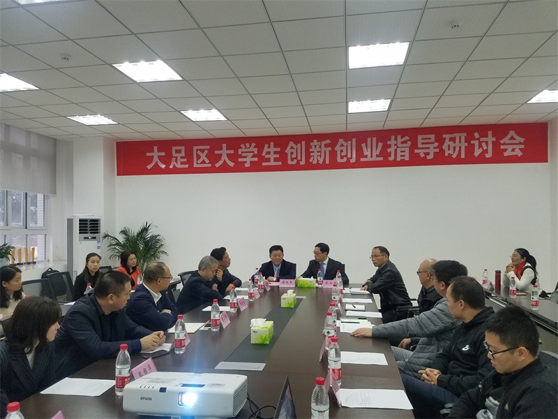 本网讯(文/图 双桥校区综合办 王瑜琳)11月15日下午,由大足区人力资源和社会保障局主办,重庆工程学院承办的大足区大学生创新创业指导研讨会在我校双桥校区召开。大足区人力资源和社会保障局党委书记、局长胡红兵,人社局党委委员、副局长蒋昌杰,就业局副局长曾凡明、蔡庆跃,重庆工程学院党委书记兼常务副校长张业平共同出席了此次会议,会议由副校长、双桥校区管委会主任蒋国华主持。