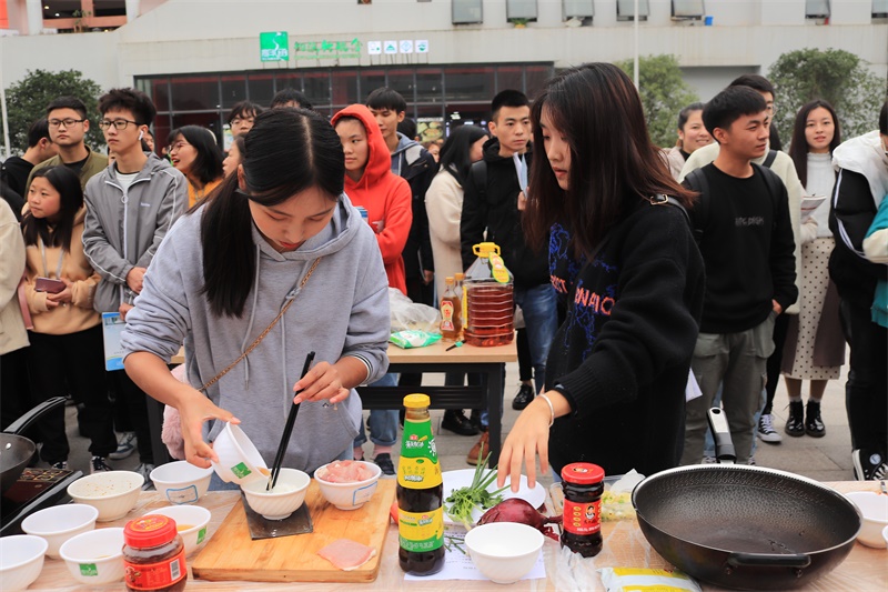 本网讯(文/大学生记者团 邓金玉 图/大学生记者团 谢家乐)11月20日下午,重庆工程学院基建后勤处、重庆工程学院学工部共同主办,大学生餐饮安全管理服务中心承办的重庆工程学院第五届“食全食美”厨王争霸赛在南泉校区和园五号广场举行。共有来自土木学院、管理学院等30组学生选手报名参加。校长助理王建东、学生处处长黄燕、基建后勤处副处长程国园出席活动,与相关部门负责老师,以及学校各食堂经理共同担任比赛评委,共有三百余师生赶到现场观看。