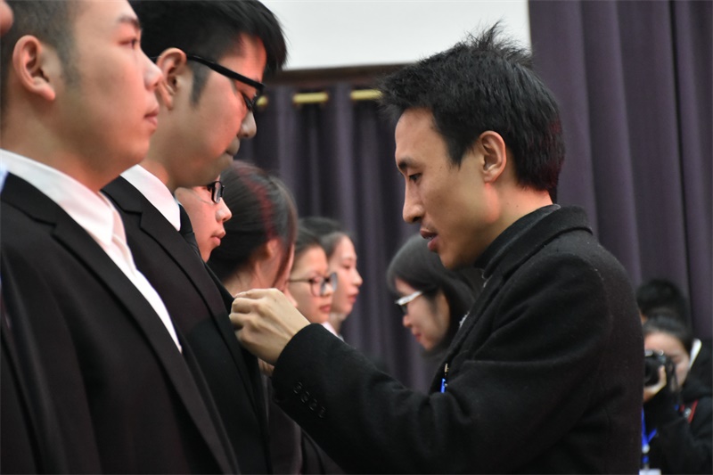 最近,学院里还有8名师生光荣的加入了中国共产党,学院领导在现场亲手为他们佩戴了党徽。面对庄严的党旗,全场新老党员一起庄重宣誓。