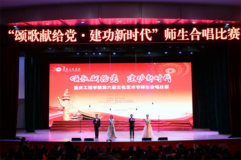 本网讯(文/校团委 尚伟 图/大学生记者团 陈绪春 张家宝)11月29日晚,我校第六届文化艺术季“颂歌献给党•建功新时代”师生合唱比赛在学术报告厅顺利举行。重庆工程学院董事李德志、校长桂国庆、校党委书记兼常务副校长张业平、副校长蒋国华、纪委书记兼工会主席唐小勇、校长助理周龙福、校长助理王建东出席,各学院参赛人员和师生观众共计1000余人全程观看了比赛。