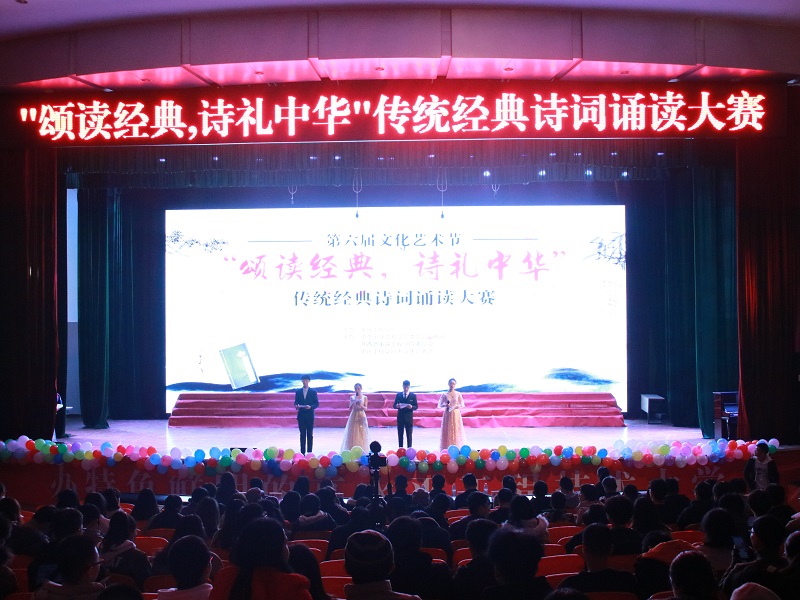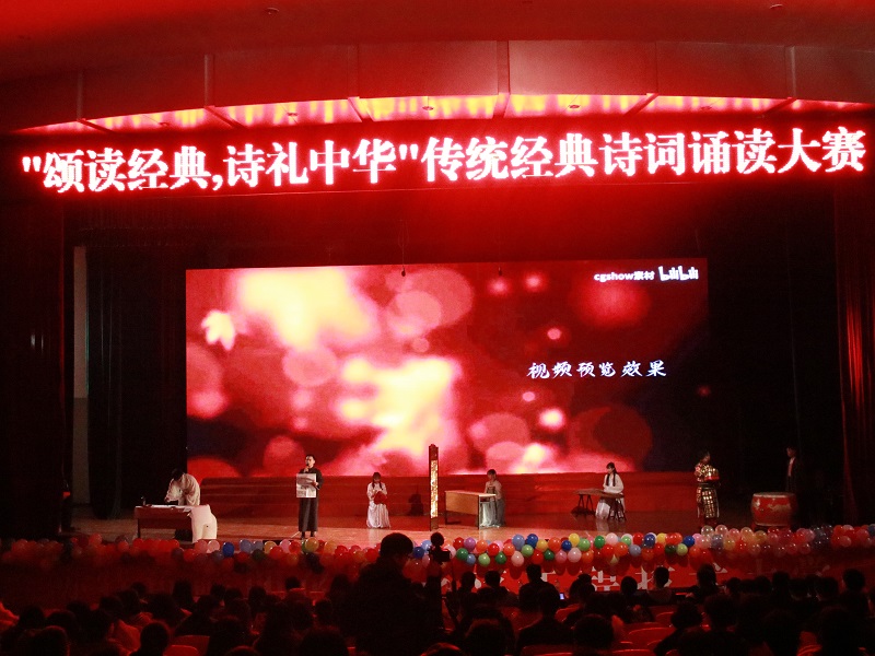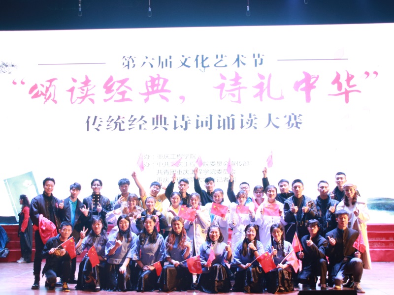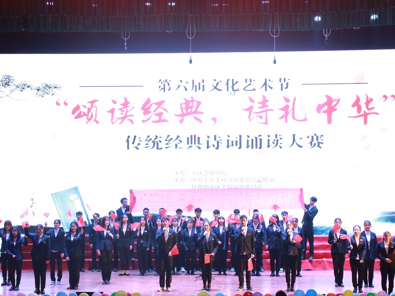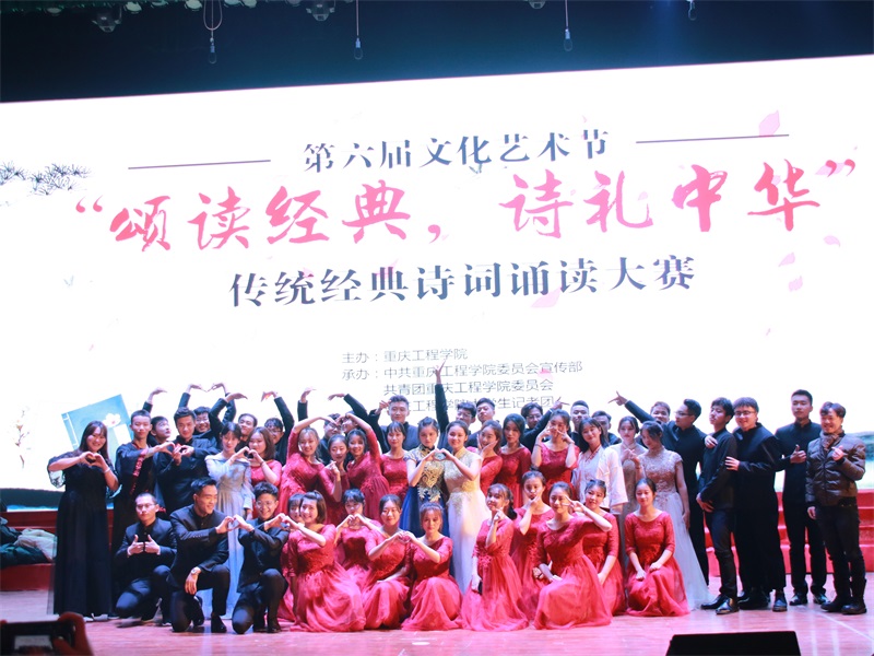 本网讯(文/大学生记者团 郭铃钰 图/大学生记者团 陈绪春 张家宝)为弘扬中华优秀传统文化,丰富大学生文化艺术素养,12月5日晚,重庆工程学院第六届文化艺术节暨传统经典诗词诵读比赛在学术报告厅举行。本次比赛以“颂读经典,诗礼中华”为主题,由我校党委宣传部、校团委、大学生记者团联合承办。当晚,宣传部副部长赵洪浪、计算机与物联网学院党总支书记覃华伟,数字艺术学院党总支书记徐小辉,大数据与人工智能学院党总支书记吴优,电子信息学院党总支书记刘子菱,双桥校区团委书记刘琳靖受邀出席,思政部黄炜、校团委副书记尚伟、管理学院学工处主任付睿受邀担任比赛评委,现场座无虚席,共计有1000余名学生观看。