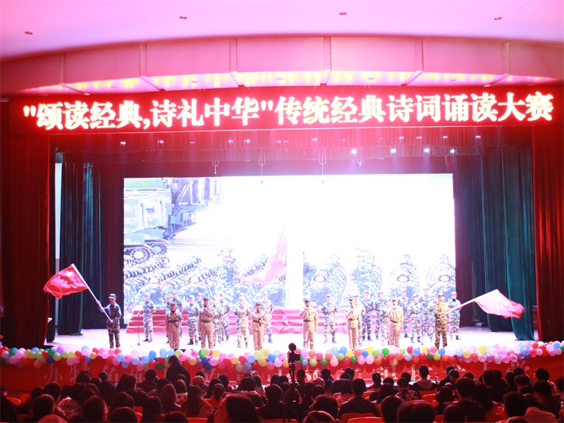 晚上6点30分,校团委学生团队工作部表演的《国忧》正式拉开了比赛帷幕,来自七个专业学院和双桥校区的13个参赛节目依次登场亮相。节目以诗词朗诵为主,形式有领诵和集体朗诵,中间伴有舞蹈、情景短剧、器乐演奏等节目表演。诗歌内容丰富形式新颖,经典诗词选用了《九歌·山鬼》《短歌行》《水调歌头·明月几时有》《以青春之我,创造青春之中国》《沁园春·长沙》等古今名篇,也有以《生日礼赞》《中华颂》《我的祖国》为主题的现代优秀诗文朗诵篇目。比赛现场气氛热烈,高潮迭起,选手们声情并茂、激情澎湃的朗诵,借古励今,以诗言志,诠释了对诗词文化的理解,精彩展现了中华古诗词音、形、意的美。同学们饱含情感的诗词诵读和精彩的节目表演赢得了现场观众的热烈掌声,表演结束后还设置了抽奖环节,现场抽取到了六名幸运同学获赠节目小礼品。