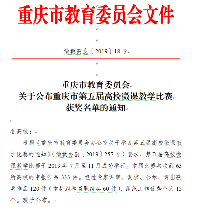 据悉,本次比赛是重庆市教委组织,由重庆市高等教育学会主办、高教学会教育技术专委会、高等教育出版社承办。此次共有63所高校申报的作品333件,通过专家对竞赛作品从选题设计、教学内容、作品规范、教学效果等方面进行线上评审与线下复核,最终评选出获奖作品120件。我校高度重视此次比赛,开展了校内微课竞赛优秀作品的初选,并组织优秀教师对其作品进行反复设计、修改和制作,最终打破了重庆市高校微课教学比赛零获奖的记录。本次比赛有效推进了我校信息技术手段在教学中的运用,促进了教学的改革与发展,进一步提高了教师信息化水平和教学质量。