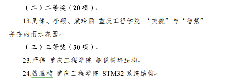 本网讯(文/图 教务处 魏玉琛)近日,重庆市教育委员会公布了《关于公布重庆市第五届高校微课教学比赛获奖名单的通知》,我校土木工程学院教师周俸、李颖、袁玲丽的参赛作品《“美貌”与“智慧”并存的雨水花园》获二等奖,软件学院教师严伟的《趣说循环结构》、电子信息学院教师钱雅楠的《STM32系统结构》分获三等奖。