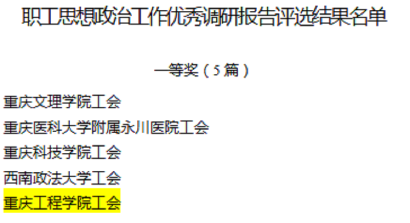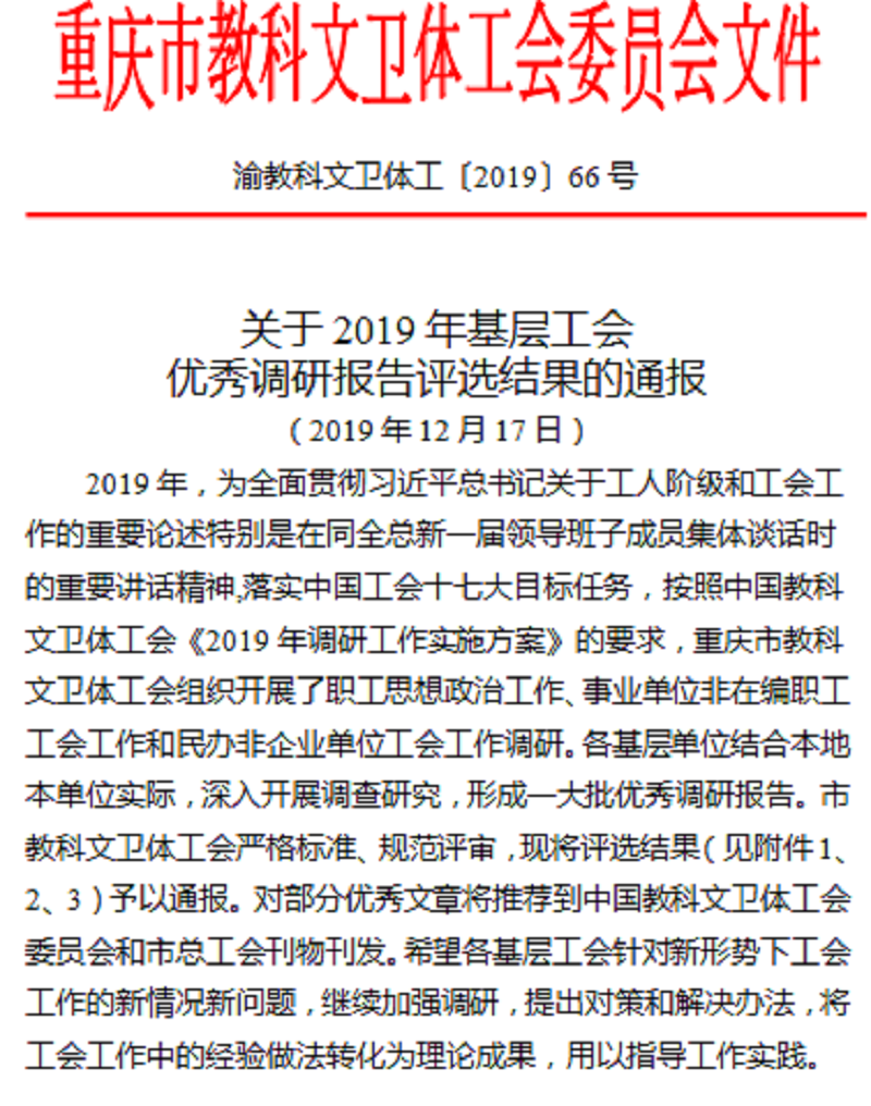 本网讯(文/图 校工会 熊力)为学习贯彻习近平总书记同中华全国总工会新一届领导班子成员集体谈话时发表的重要讲话精神,按照中国教科文卫体工会《2019年调研工作实施方案》的要求,12月17日,重庆市教科文卫体工会发布了《关于2019年基层工会优秀调研报告评选结果的通报》(渝教科文卫体工〔2019〕66号)评选通报文件,我校上报的两份调研报告均荣获一等奖,本奖项也是全市民办高校唯一同时荣获殊荣的高校。