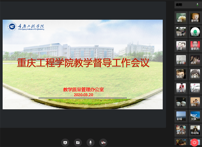 本网讯(教学质量管理办公室 周亮)为保障我校教学督导工作有序开展,稳步推进在线教学诊改工作,提升教学督导工作水平, 3月20日下午,重庆工程学院教学质量管理办公室组织召开2020年第一次教学督导工作会议。学校副校长王琼花、校长助理周龙福、各二级学院分管教学副院长、教务处、人事处、学生处、校院两级督导组全体成员50余人参会,会议利用企业微信平台召开。