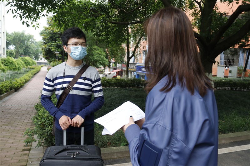 数字艺术学院16级数字媒体技术专业学生黄泽森从重庆忠县乘高铁到重庆北站,他分享了自己从下车出站到进校回寝的经过:“一走出出站口我就看到了穿着印有‘蓝色引路人’工作服的志愿者们,他们对我进行身份核对和体温检测。接驳车到站后所有人依次排队上车,在车里大家自觉保持安静并戴好防护口罩,彼此间保持安全距离。进校时重新进行了体温测量、对行李箱进行消毒、扫描渝康码,整个过程快速高效、条理清晰。到了宿舍楼门前,不同学院设有不同接待点,所有人再次测量体温、提交健康承诺书、扫描行程码和渝康码、填写详细返校行程轨迹,现场还准备了矿泉水、纸巾、洗手液、藿香正气液等。在通过层层检测之后才能回到寝室,我认为学校的安全检查工作做得十分细致到位,同学们一进学校就能安心、放心。”
