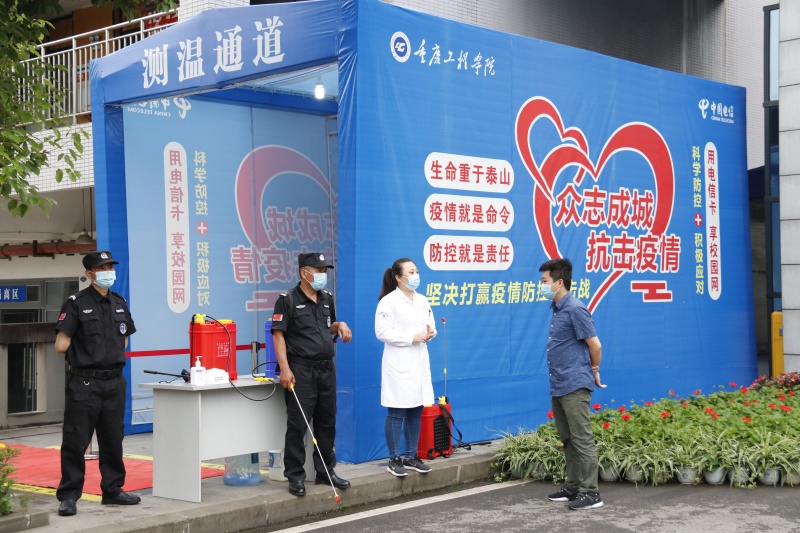 作为学校安全保护的第一道屏障,保卫处在校门口一侧专门搭建了测温通道,安保人员将对进校学生逐一进行体温测量,旁边还设有隔离观察区,确保健康监测工作稳步到位。据保卫处综合管理负责人罗心智介绍,体温正常的学生可直接放行,体温异常的学生则要求在隔离点进行观察,“一旦发现有体温超过37.3℃的学生,就需要到旁边的隔离点进行观察。十分钟之后体温如果持续升高,保卫处将立刻联系后勤处和巴南区南泉医院,派救护车将学生送往医院进行治疗。经专业检测后,排除新冠肺炎感染的学生返回学校进行14天隔离观察,一旦确诊后则立刻送往指定医院进行隔离治疗。”