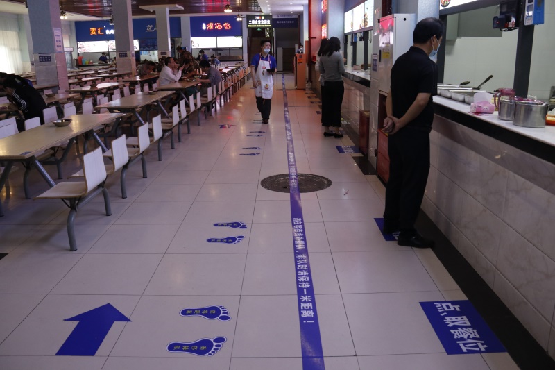 学校食堂为迎接学生陆续返校做了充分准备,南泉校区食堂一粟堂、百谷园、四食堂已正式运营,基础餐配备齐全。按照学校要求,食堂实行分段供餐,上午一二节课无课或三四节课无课的学生实行错峰就餐。食堂内还印制了“单循环”路标线,要求所有人遵从统一用餐流程和进出方向,师生用餐时保持1米以上距离,防止 “面对面”用餐和避免近距离接触。此外,基建后勤处商业科负责人杨坤还提到,按照重庆食品药品监督管理局的要求,学校食堂每天都要完成一次全方位、无死角消毒,“我们对食堂的桌面、地面、档口、卫生间等不同区域都有不同的消毒液配比标准,各个食堂还增设了塑料餐具和废弃口罩回收点,每天都会定时做好清理,避免因垃圾量陡增而造成二次污染。”
