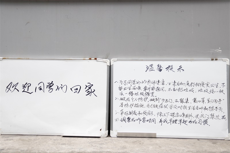 学生公寓针对疫情防控也制定了新的管理措施,学生返校后要求使用门禁卡刷卡进出,楼道里的垃圾桶被集体摆放到楼下,寝室里每天都进行一次卫生消毒, 宿管人员对晚归学生要单独进行健康检测。宿管阿姨们为了迎接同学们回校也早早开始工作,按照学校要求,4月26日全体人员到岗轮流值班,并对各自负责的楼栋进行卫生清洁、防疫消毒和通风检查。和园4号的宿管员彭昭莉说起了近期完成的主要工作:“前几天天气好,我们帮不少寝室晾晒了棉被,对每一间寝室都进行了维修检查,发现有问题后及时联系工作人员进行维修。除此之外我们还对每一间的寝室饮水机和公用洗衣机进行消毒,并在楼道入口处的黑板上写了防疫期间的注意事项,希望同学们一进门就能够看到。”