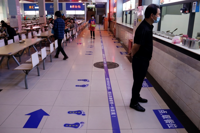 学校食堂为迎接学生陆续返校做了充分准备,南泉校区食堂一粟堂、百谷园、四食堂已正式运营,基础餐配备齐全。食堂实行分段供餐,上午一二节课无课或三四节课无课的学生实行错峰就餐。食堂内还印制了“单循环”路标线,要求所有人遵从统一用餐流程和进出方向,师生用餐时保持1米以上距离,防止“面对面”用餐和避免近距离接触。