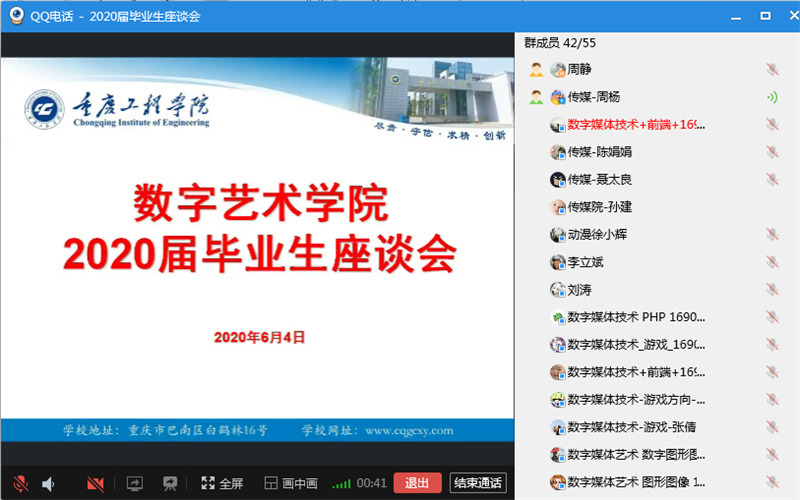 本网讯(文/图 数字艺术学院 周静)6月4日晚,数字艺术学院通过QQ网络会议组织召开了学院2020届毕业班生座谈会。学院领导班子成员,就业科、学工、实习实训中心、办公室全体成员及2020届各专业35名毕业学生代表参加会议。