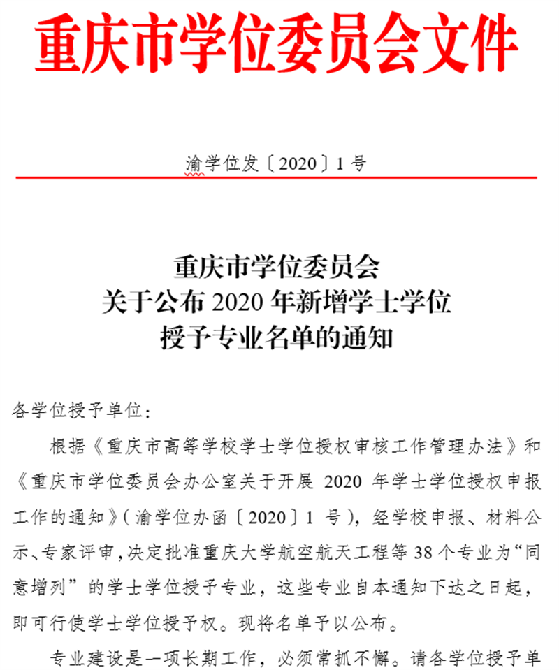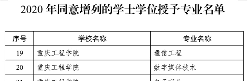 本网讯(文/图 教务处魏玉琛)日前,重庆市学位委员会发布了《重庆市学位委员会关于公布2020年新增学士学位授予专业名单的通知》(渝学位发〔2020〕1号),公示了重庆市高等学校2020年新增学士学位授予专业名单。我校通信工程、数字媒体技术和电子商务3个专业顺利通过审核,获得学士学位授予权。