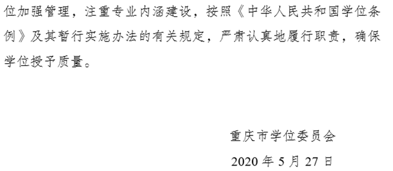 今年3月上旬至4月下旬期间,我校按照重庆市学位委员会相关工作要求,各专业在申报材料通过学院初审的基础上,还邀请了相关学科领域专家组成评审团队对申报材料进行网络评审。专家组在认真审核专业材料、较为全面掌握专业建设情况的基础上,认真提出了评议意见和修改建议,各二级学院及专业根据专家建议作了相应修改和完善。经过了相关二级学院及职能部门的通力配合,申报材料于今年4月按时报送至了市学位委员会。经市学位委员会专家审查、材料公示,我校3个专业顺利通过审核。