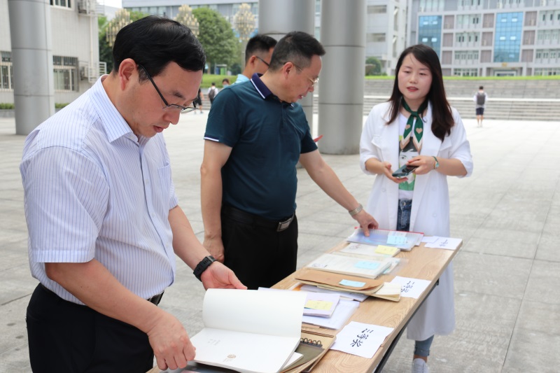 本网讯(文/图 思政部黄炜)为落实高等学校本科教育工作会议精神,进一步提高本科人才培养质量,我校举办了首届“小笔记·大思政”优秀思政课笔记评展活动,展出时间从6月24日至6月30日。24日中午,优秀笔记在大学生服务中心前广场正式展出,校党委书记谭明术、副书记张业平、思政部部长胡海燕亲临现场参观了展出笔记,另外还吸引了刚刚下课的同学们赶来观看。