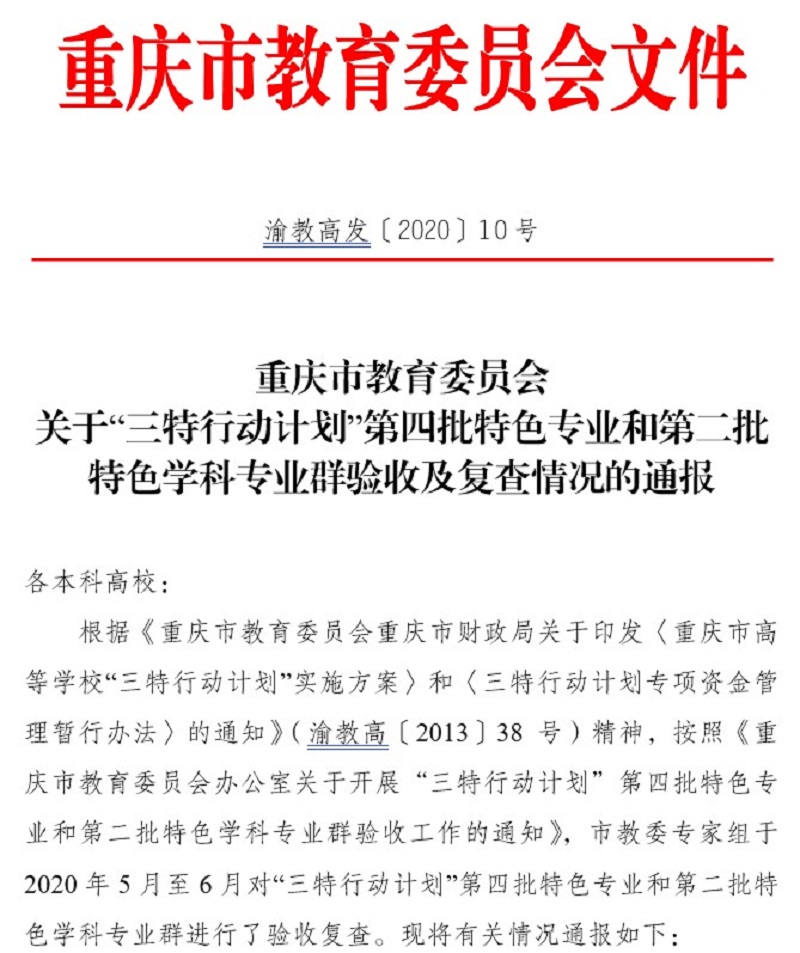本网讯(文/图 教务处魏玉琛)7月10日,重庆市教育委员会公布了《关于“三特行动计划”第四批特色专业和第二批特色学科专业群验收及复查情况的通报》(渝教高发〔2020〕10号),我校物联网工程顺利通过市级特色专业验收。