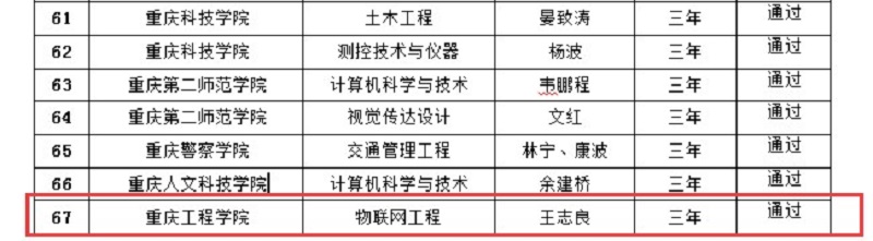 据悉,本次共有25所本科高校的73个建设期满的特色专业接受了市教委的验收,其中65个专业通过验收,8个专业暂缓通过。物联网工程专业于2016年正式确立为重庆市本科高校“三特行动计划”特色专业建设项目,学校从人才培养模式改革、课程建设、实践教学体系建设、师资队伍建设、教学研究与改革等方面给予了大力支持。我校物联网工程专业通过主动服务国家战略和地方经济社会发展的需求,明确专业定位、凝练专业特色,进一步凸显专业优势,提升专业实力和社会影响力,突出专业特色。