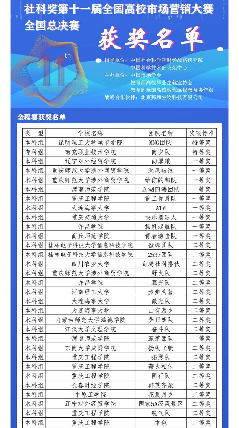 据悉,社科奖全国高校市场营销大赛已连续举办十一届,作为全国商科学术界、教育界和企业界共同参与的综合性竞赛平台,社科奖大赛积极深化教育部全体系人才培养方案,通过营销实务教学、以赛促学机制推动高等院校创新创业教育与营销实践课程体系和内容的改革,为指导老师、参赛学生搭建一个创新实践平台。我校学生在大赛中充分展示了创意水平,提升了营销实践能力和综合素质,充分展示了重工学子的优秀风采。