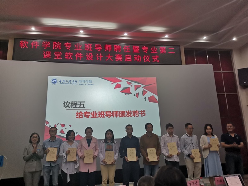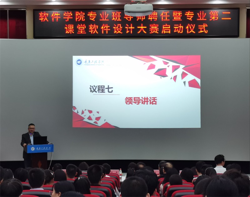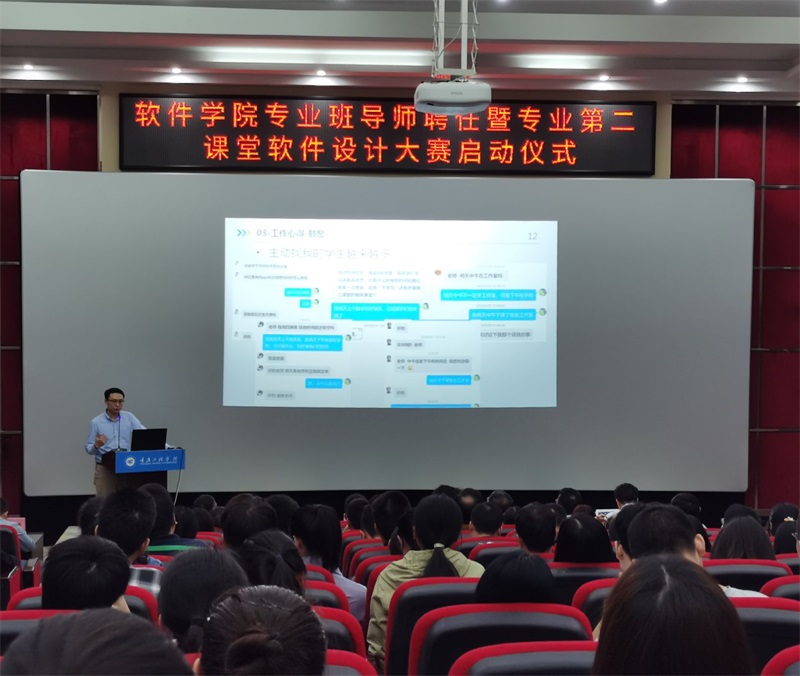 本网讯(文/图 软件学院 胡宝)9月23日下午,软件学院在原行政楼阶梯报告厅举行专业班导师聘任暨专业第二课堂软件设计大赛启动仪式。校长助理周龙福、学工部部长黄燕和软件学院党政领导出席仪式,软件学院各系和部门负责人、全体专业班导师、本科班辅导员和各班级班长、学习委员到场参加,本次仪式由学院学生工作室副主任胡宝老师主持。