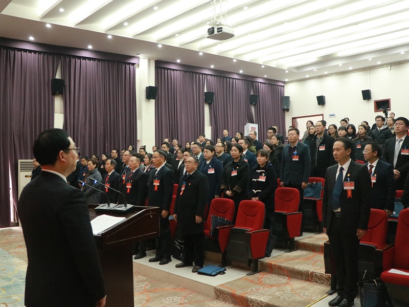 会议正式开始,全体参会人员起立,在庄严肃穆的音乐声中齐唱国歌。