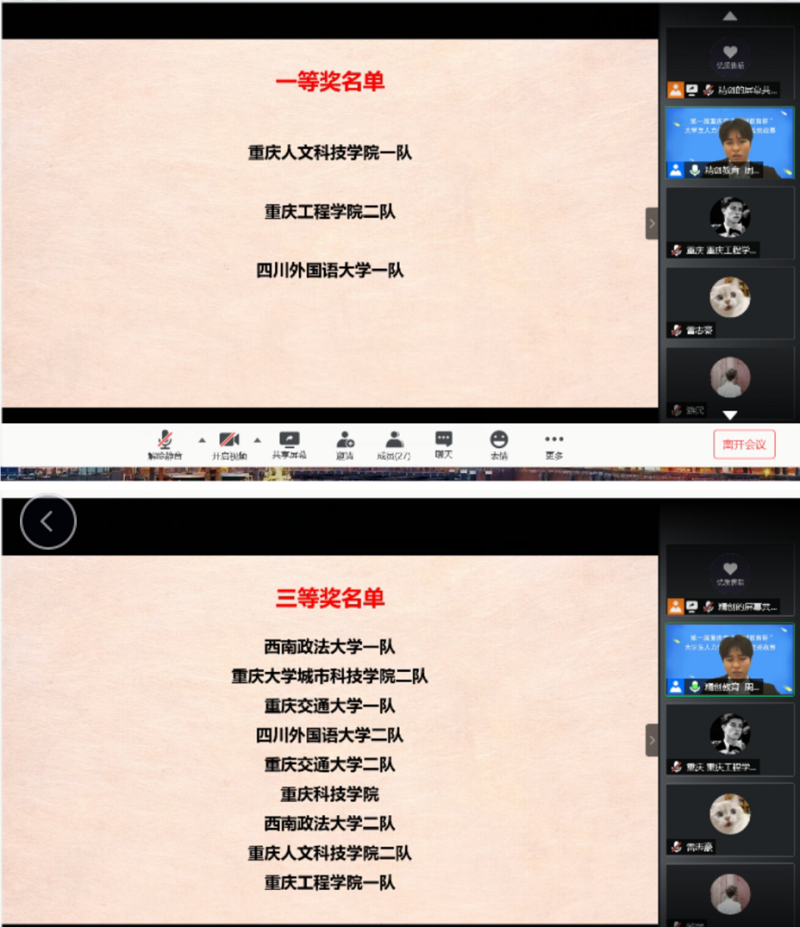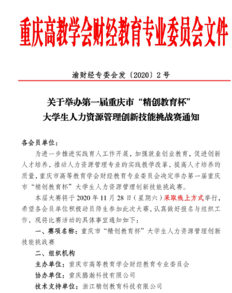 本网讯(文/图 管理学院 郭英)11月28日,第一届重庆市“精创教育杯”大学生人力资源管理创新技能挑战赛举办线上比赛,本次比赛由重庆市高等教育学会财经教育专业委员会主办,重庆工商大学、重庆师范大学、西南政法大学、四川外国语大学、重庆工程学院等多所高校参加。我校管理学院人力资源管理专业选派的两个由2019级学生组建的团队代表学校参赛,历经多个小时竞赛对抗后,最终二队获市级竞赛一等奖,一队获市级竞赛三等奖。