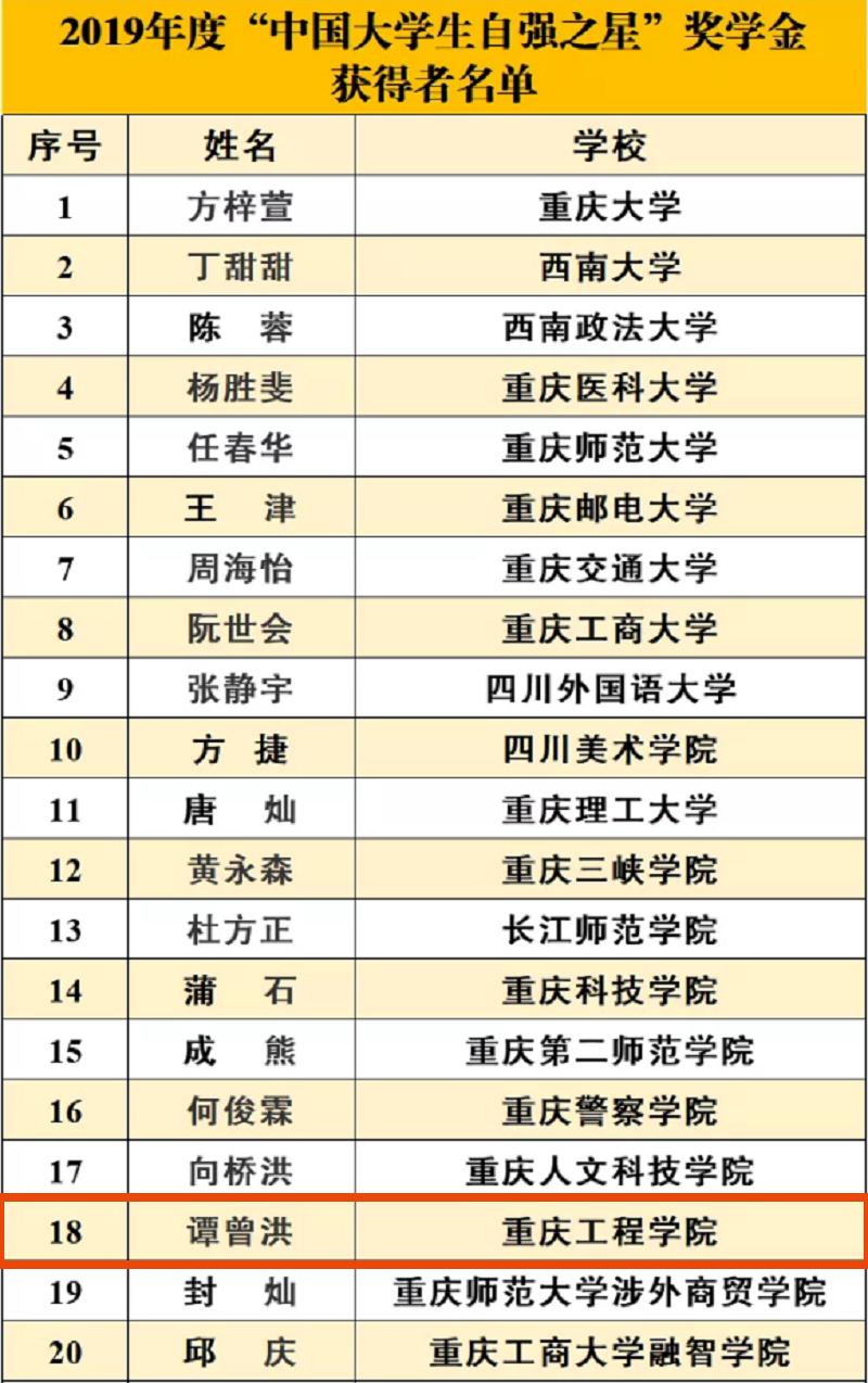 本网讯(文/图 校团委 黄涛)近日,由团中央、全国学联联合举办的2019年度“中国大学生自强之星”奖学金推报活动正式揭晓。经基层推荐、组织评定等环节,重庆市共有42名大学生荣获2019年度“中国大学生自强之星”称号,我校管理学院2018级学生谭曾洪荣获2019年度“中国大学生自强之星”奖学金。
