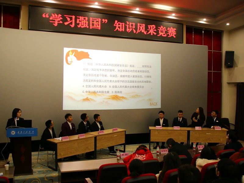 本网讯(文/大学生记者团 汪聂军 赵欣雨 图/大学生记者团 袁艺谋 官成成 吕浩)为深入学习贯彻习近平新时代中国特色社会主义思想,提升全校师生使用“学习强国”学习平台的积极性和参与度,12月11日中午,重庆工程学院2020年“学习强国”知识风采竞赛活动在南泉校区阶梯报告厅举办。本次比赛的8名选手分别由各二级学院推荐,学校党委宣传部赵鹏涛,校团委书记、学生处副处长黄涛,校组织部李毅老师担任比赛评委,各二级学院师生代表共100余人现场观看。