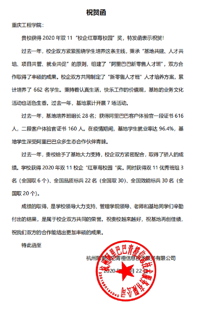 本网讯(文/图 管理学院 芦亚柯)12月24日,杭州阿里巴巴青橙信息技术有限公司发来祝贺函,我校“阿里巴巴新零售人才孵化基地”荣获2020年双11“校企红草莓校园”奖,这是学校连续第三年获得该奖项。同时,基地还获得2020年度全国双11优秀班组3个(全国取6个,获奖占比全国校企50%);全国品质标兵22名(全国取30名,获奖占比全国校企73%);全国效能标兵30名(全国取50名,获奖占比全国校企60%)的优异成绩。